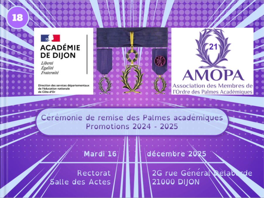 Le mardi 16 décembre 2025, en la salle des Actes du rectorat de Dijon, s’est tenue une cérémonie solennelle de remise des Palmes académiques. Ont été distingués 16 récipiendaires (promotions 2024-2025), pour certains nommés au grade de Chevalier et pour d’autres, déjà distingués, promus Officier dans l’Ordre des Palmes académiques.